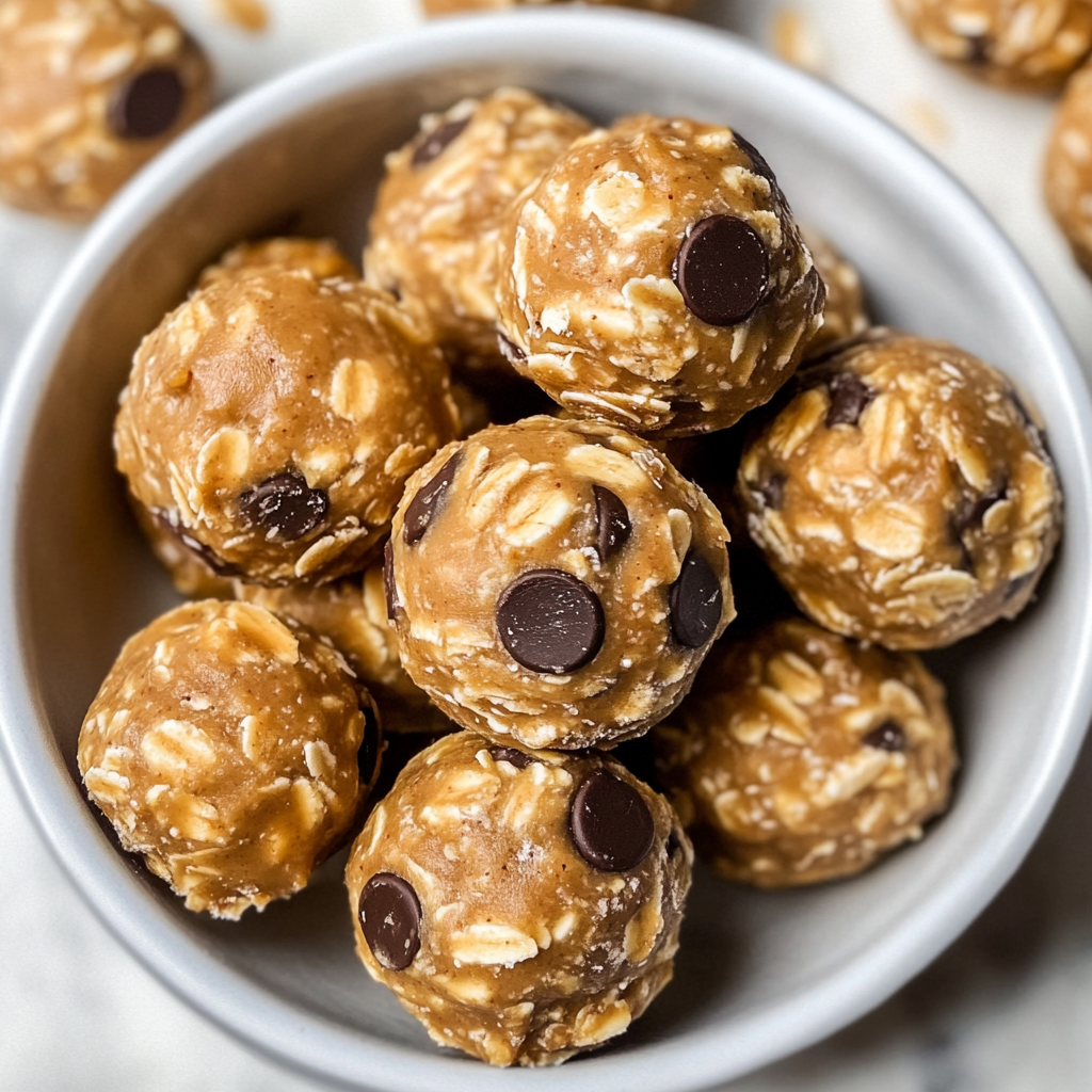 Now comes the fun part! Scoop out small portions of your dough and roll them into 1-inch balls using your hands or a small cookie scoop. Line them up on a baking sheet lined with parchment paper. Once they’re all shaped, pop them in the fridge for at least 30 minutes. Chilling helps them firm up so they’re easier to enjoy later!