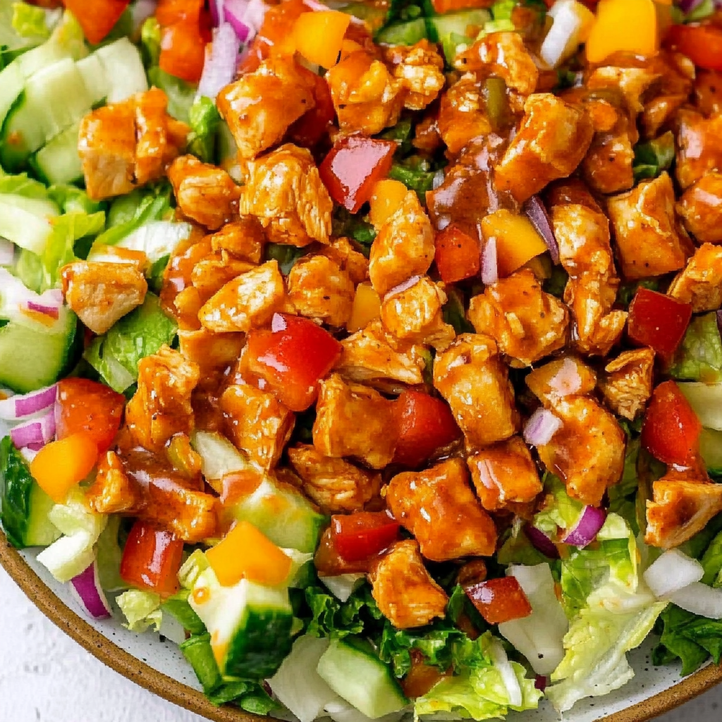 In a small bowl, combine your cooked and diced chicken with honey garlic sauce and buffalo wing sauce. Toss everything together until well-coated. This step is crucial because it infuses the chicken with that sweet and spicy flavor that makes this salad truly stand out!